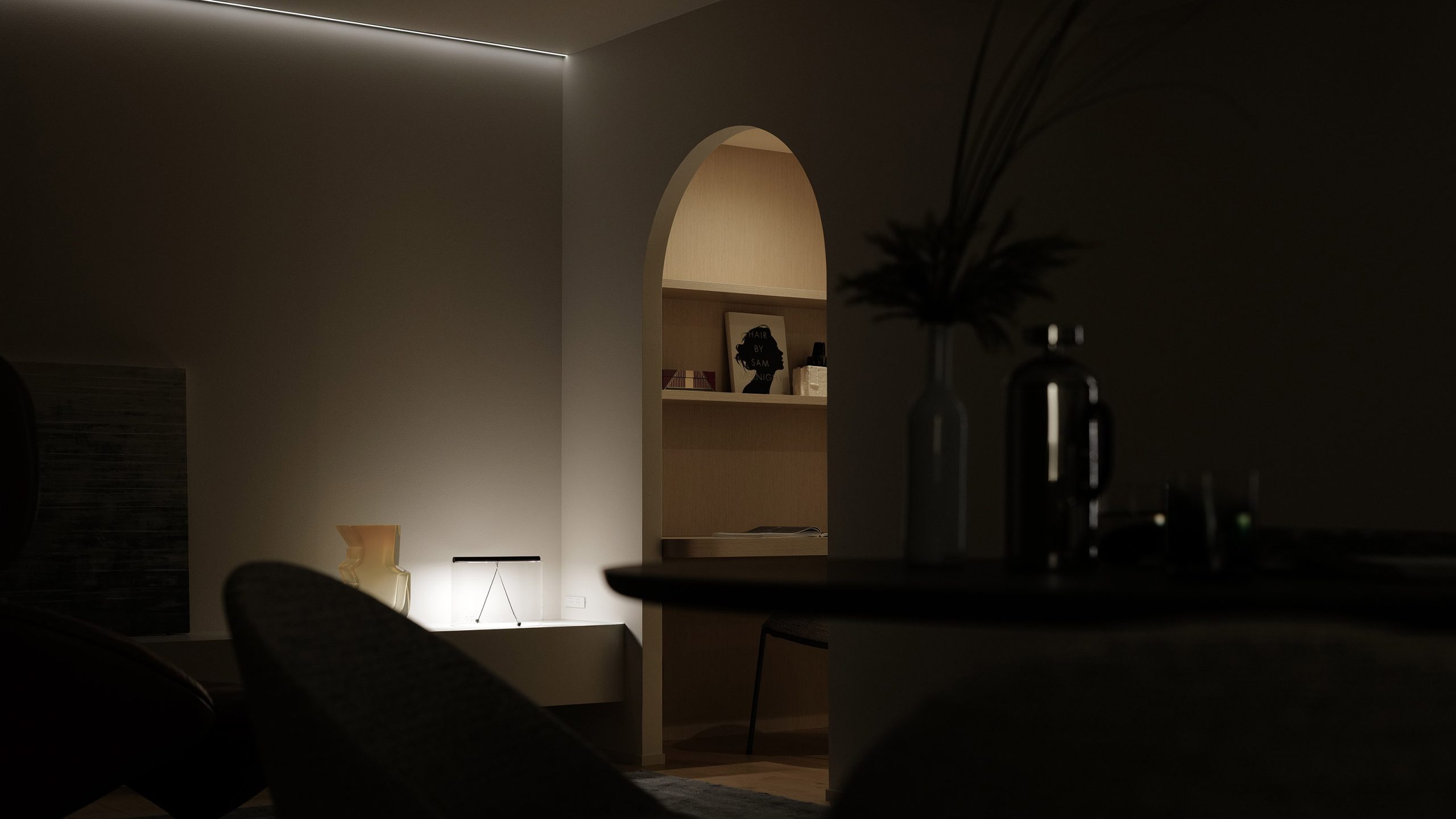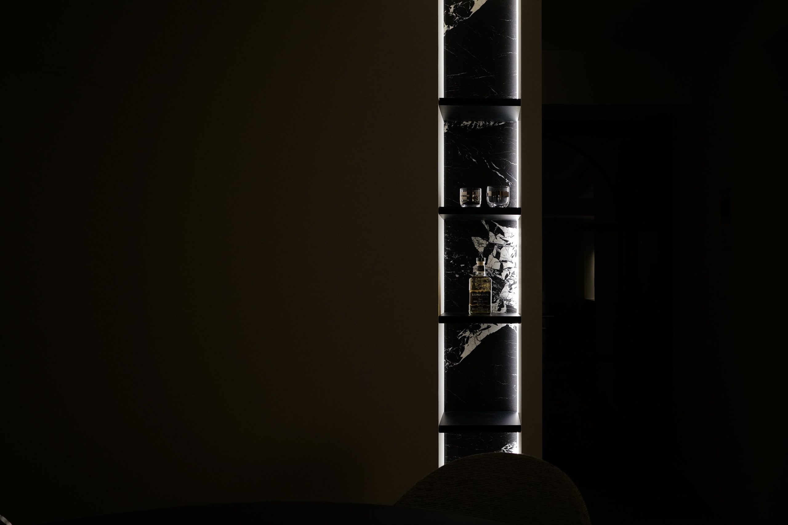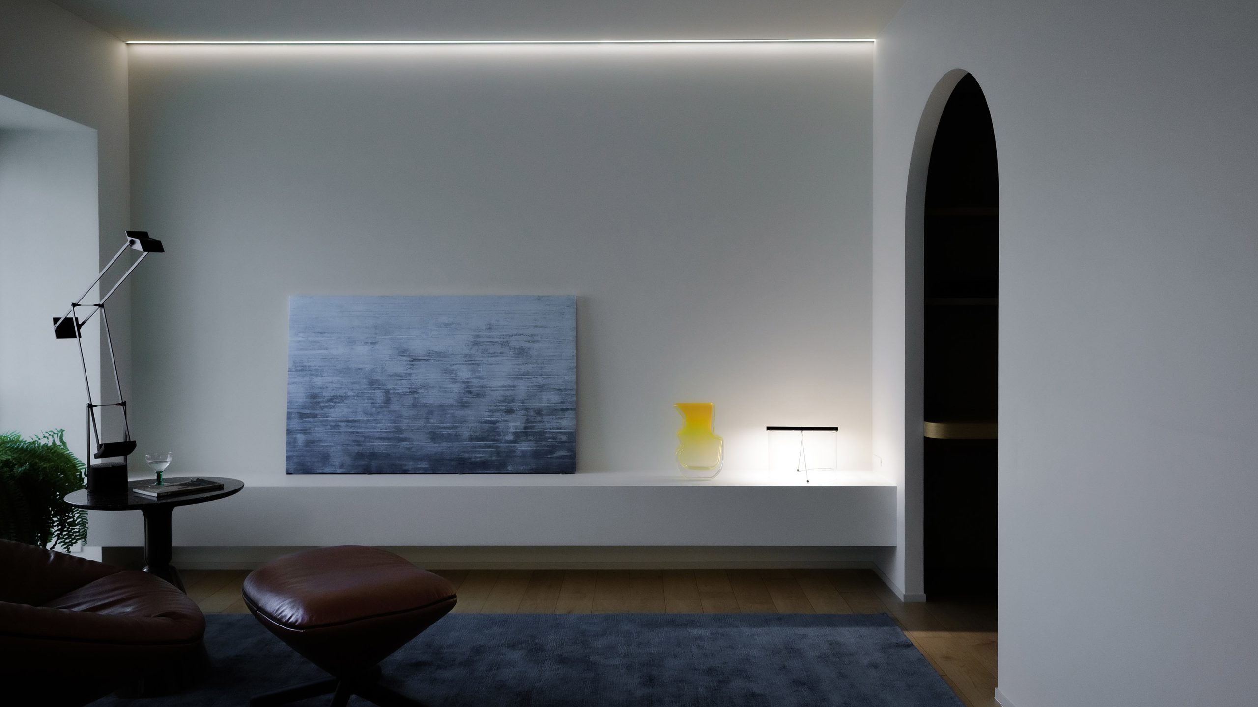 壁面に走る間接照明は、昼と夜で異なる表情を生み出します。