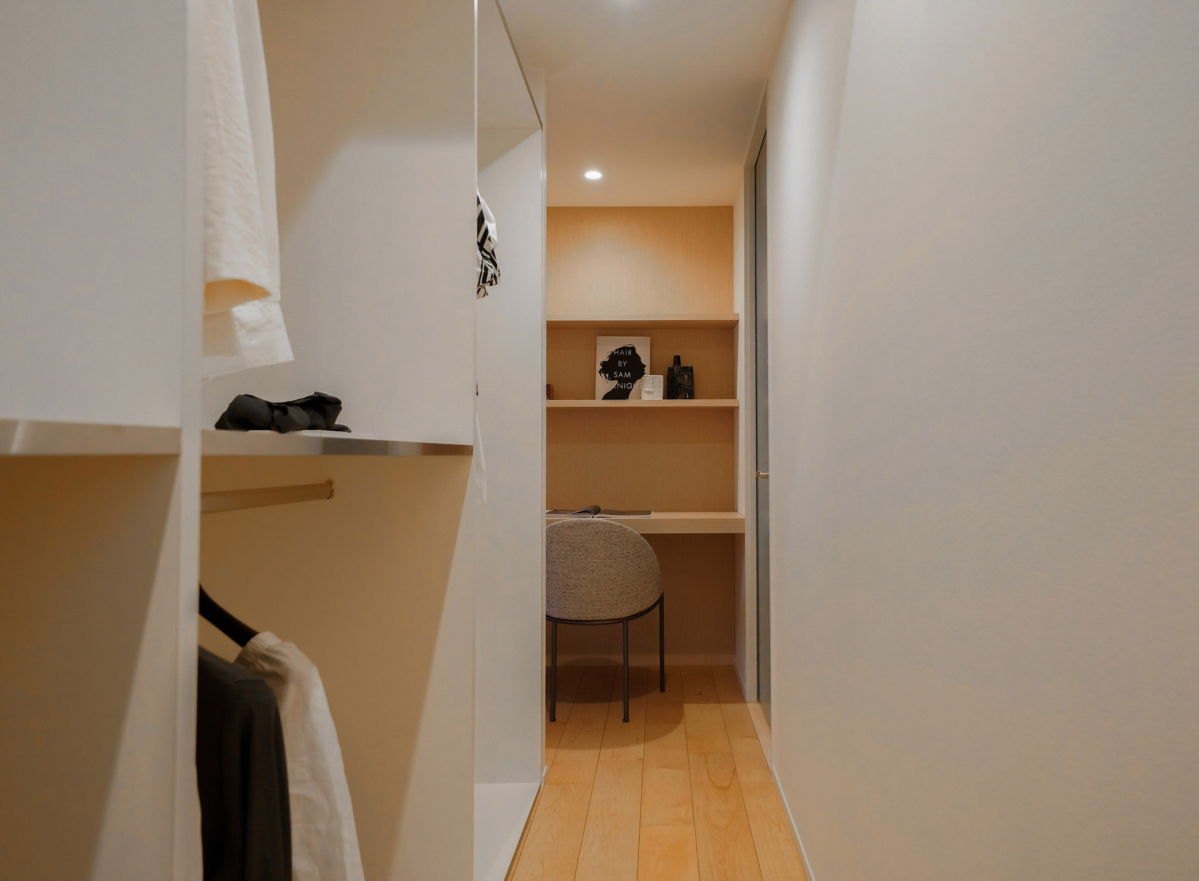 回遊性のあるウォークスルーのクローゼットを隣接させ、