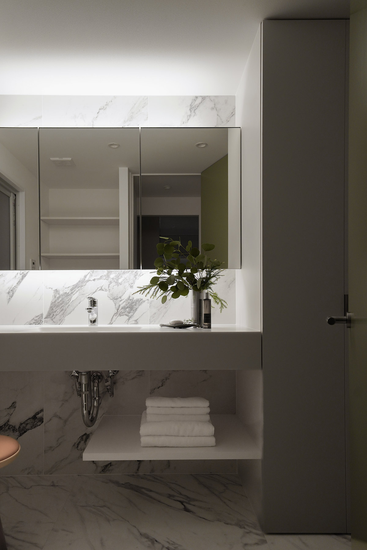 既製の洗面をオーダーサニタリーに変更し、ミラーキャビネットで収納量をプラス。